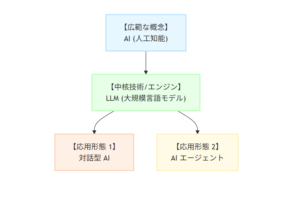 A[【広範な概念】<br>AI (人工知能)] –> B[【中核技術/エンジン】<br>LLM (大規模言語モデル)];